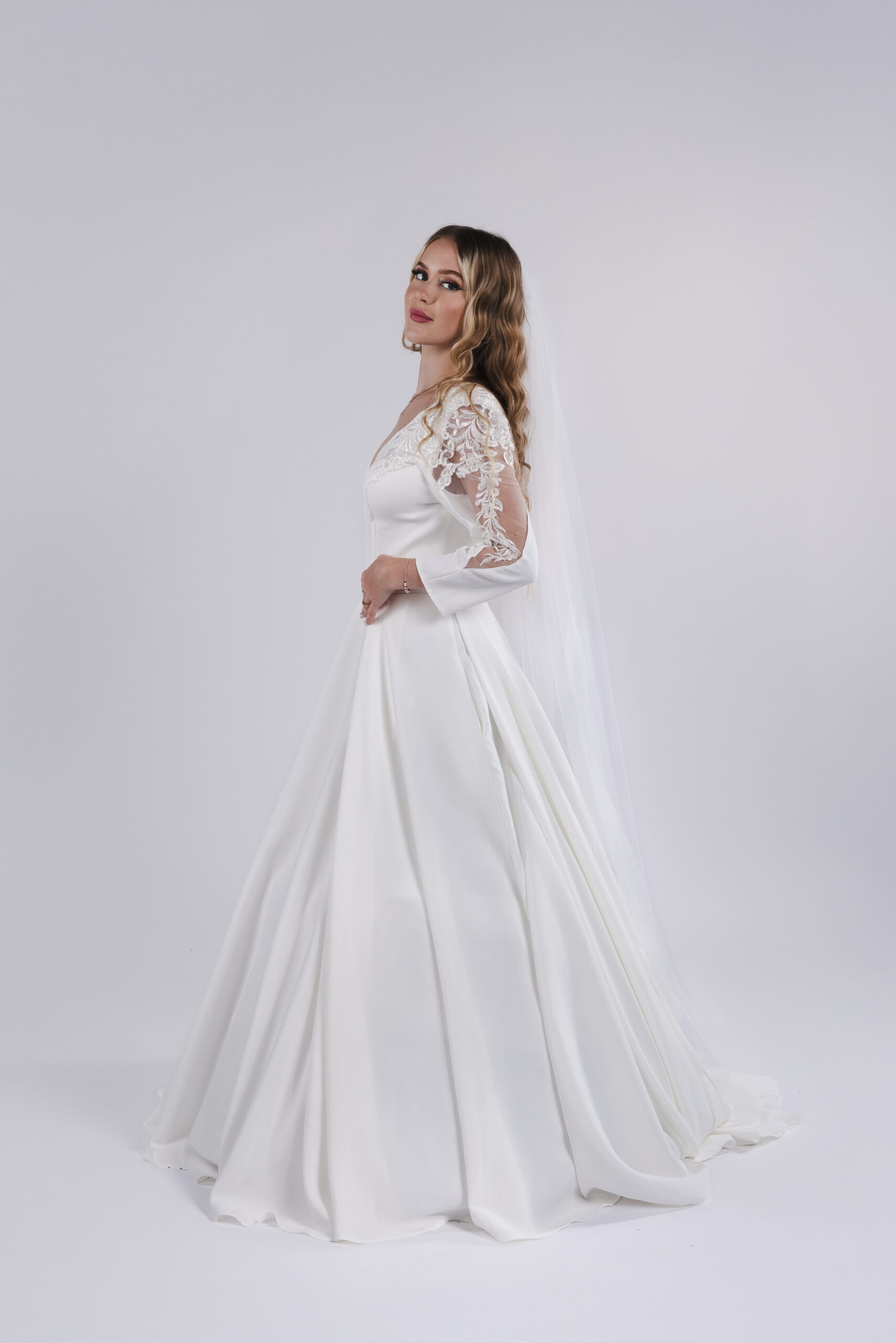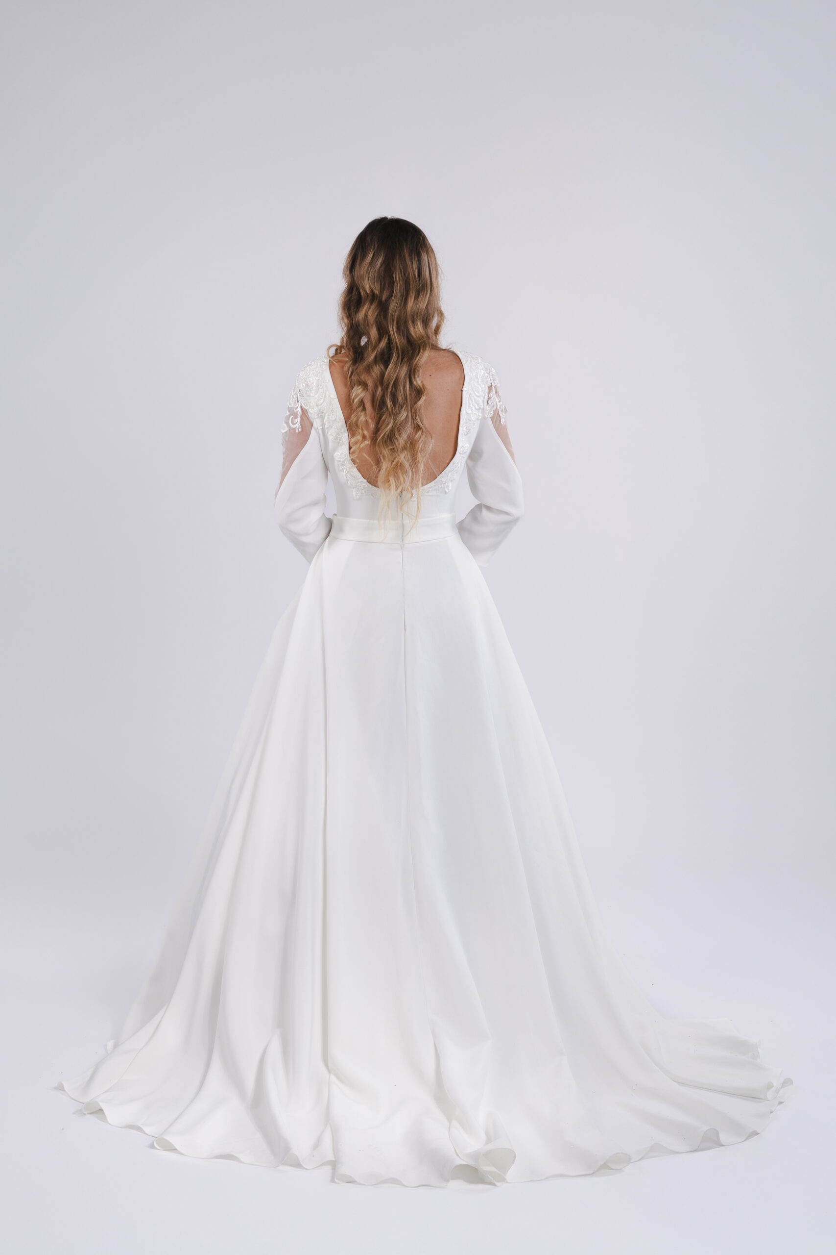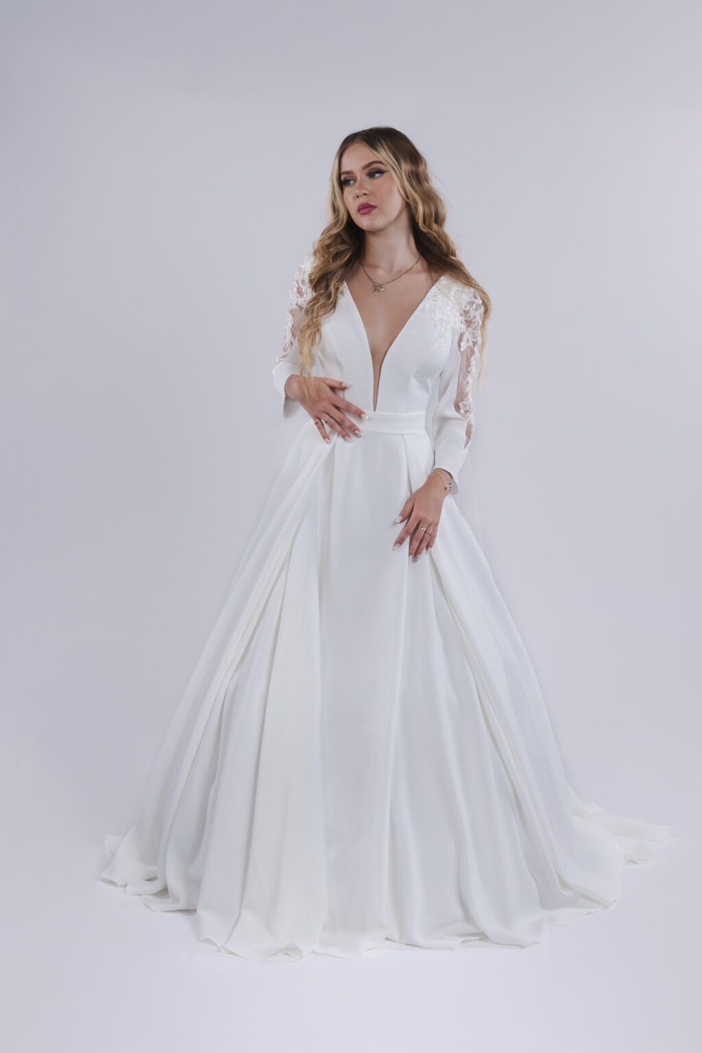Splývavé svatební šaty DENISA s rukávy. Střih tvaru A, na zádech zip, krajkové vsadky na rukávech.